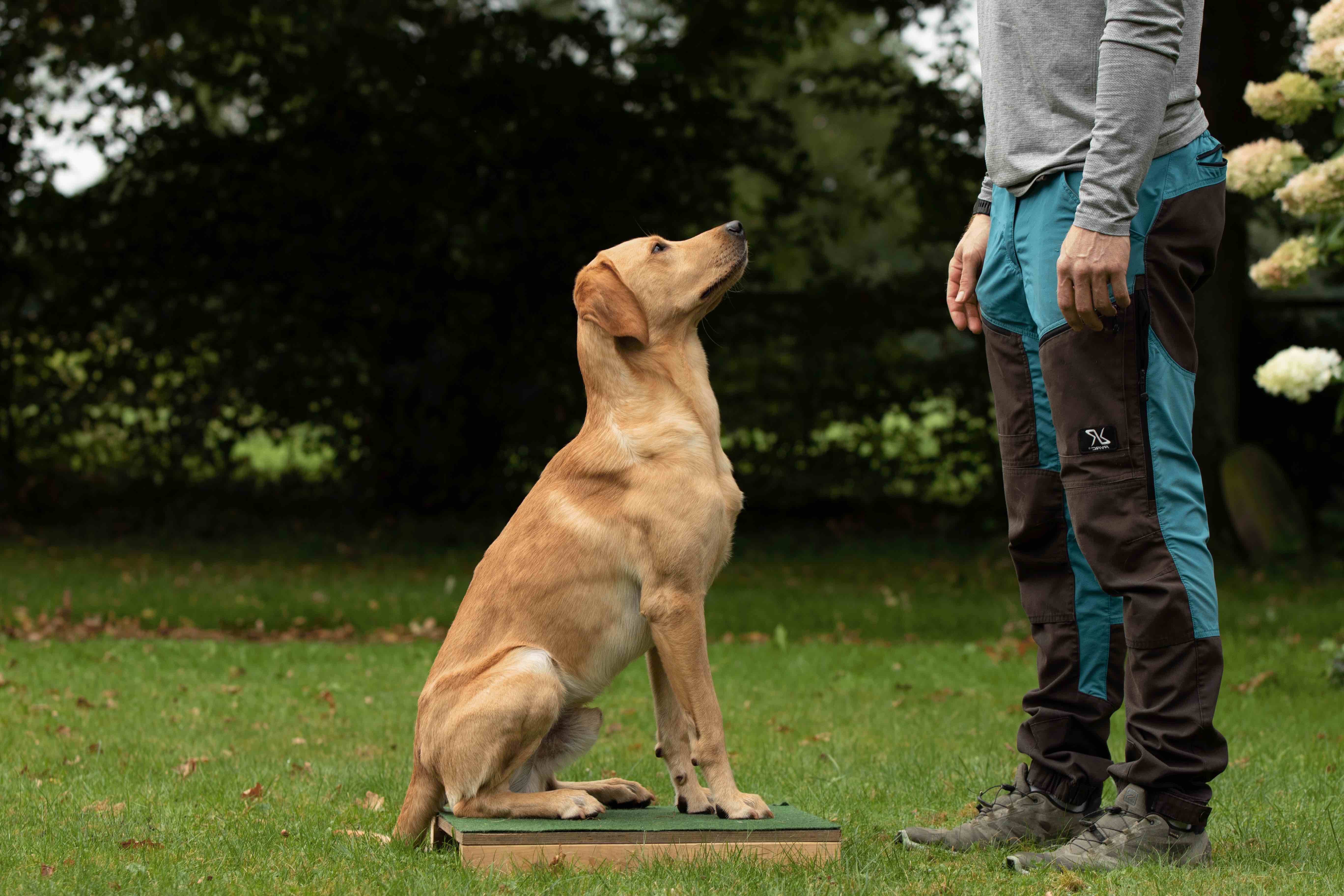 Ihr Hund bleibt auf der Plattform vor Ihnen so lange auch unter Ablenkung sitzen, bis das Verhalten mit einem Signal aufgelöst wird.
